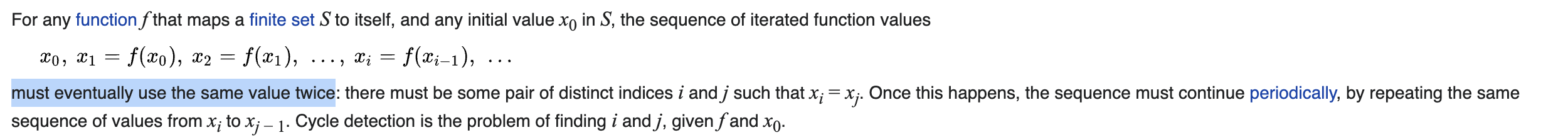 There is a neat mathematical proof that states if there is a cycle in a list then it must repeat a value twice.