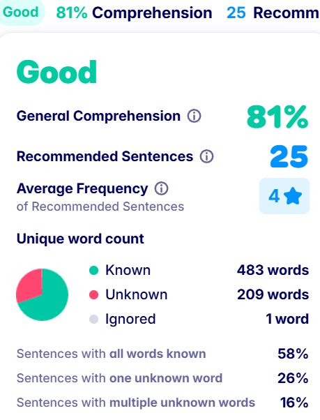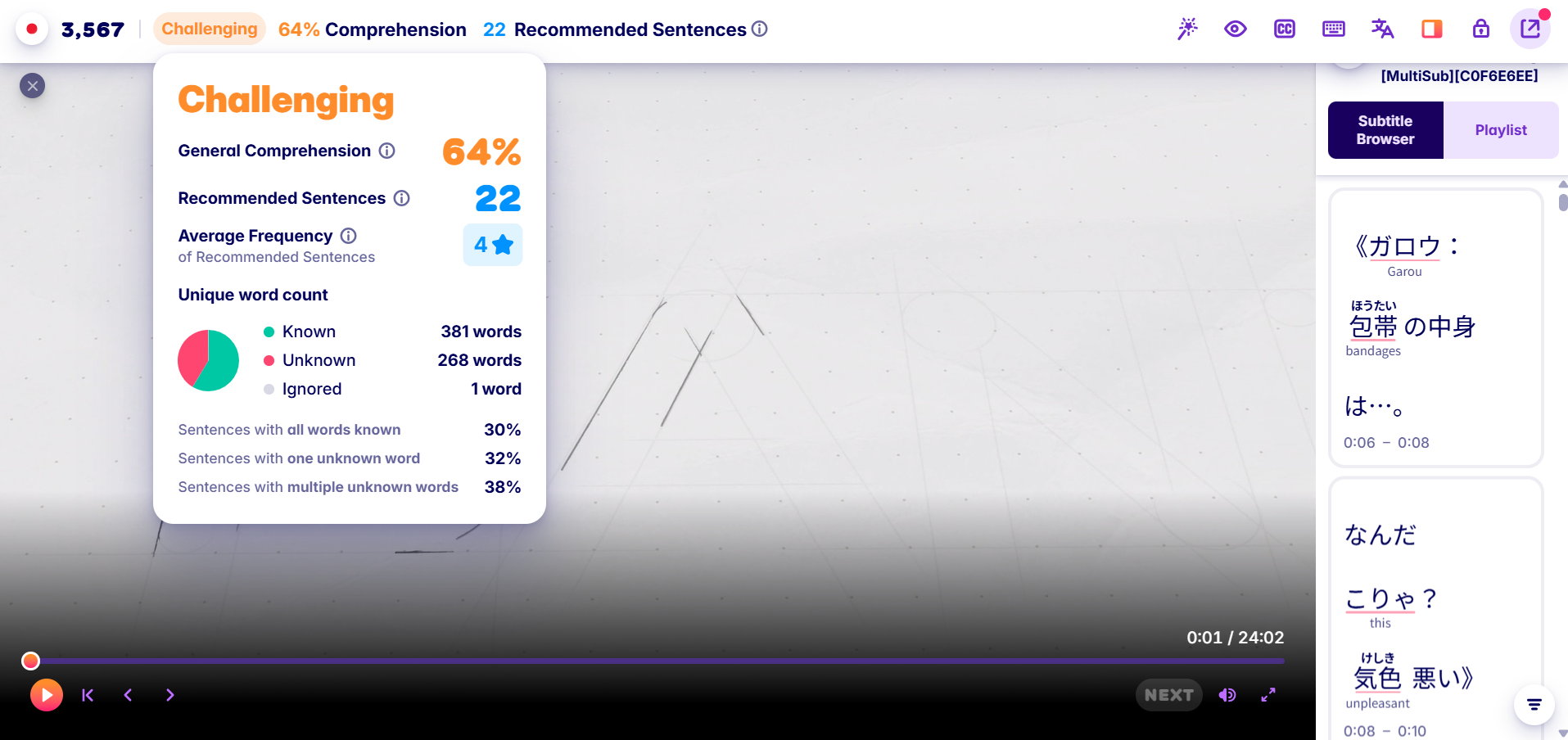 Migaku shows you an estimated comprehension score for the video you want to watch. It uses the frequency of the words and your known words to calculate this.