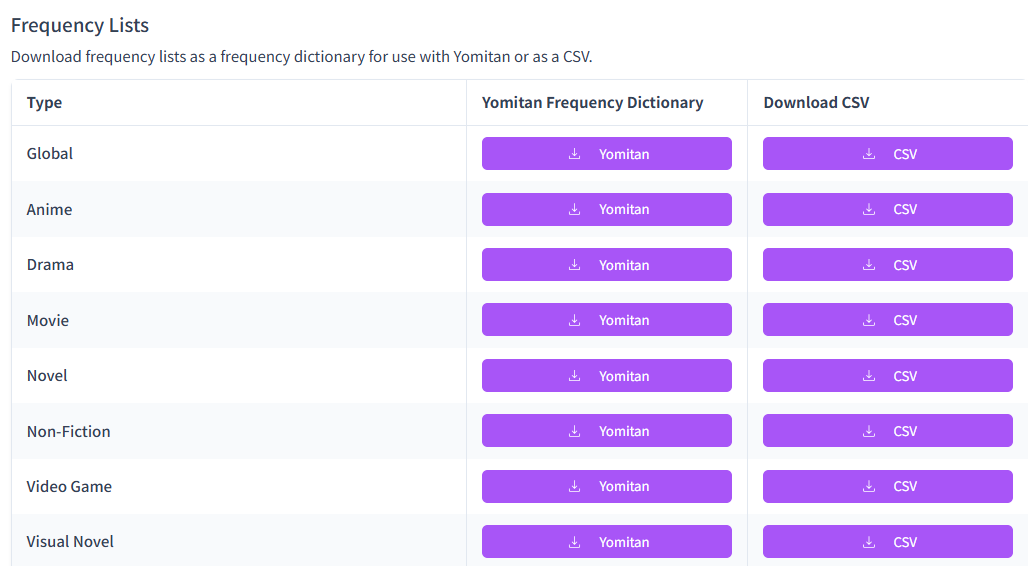 Speaking of dictionaries, you can download global frequency lists on Jiten too: