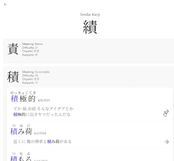 View similar Kanji, and view other flashcards that you made that use that kanji!