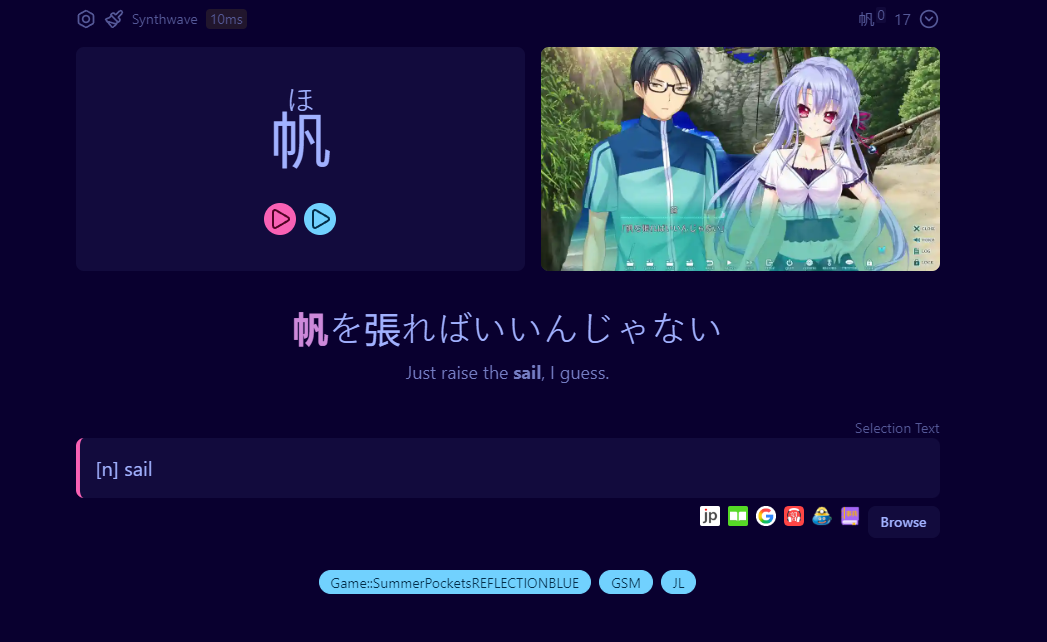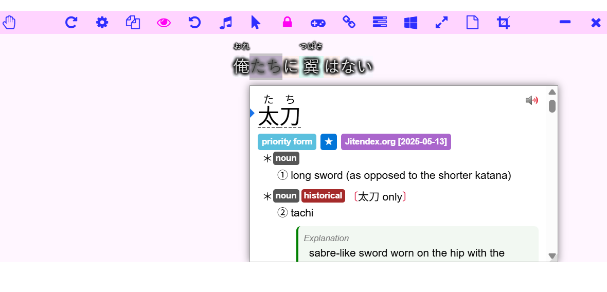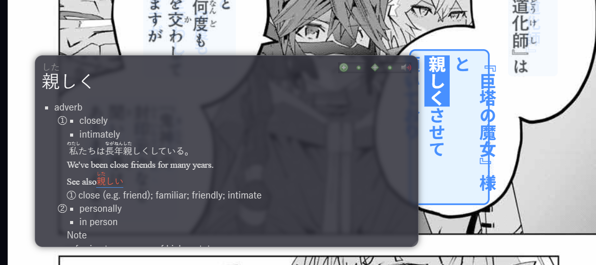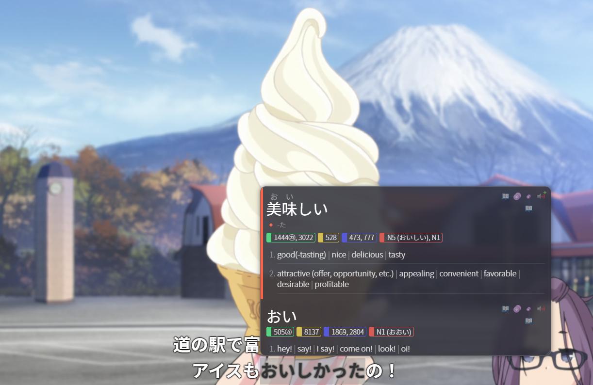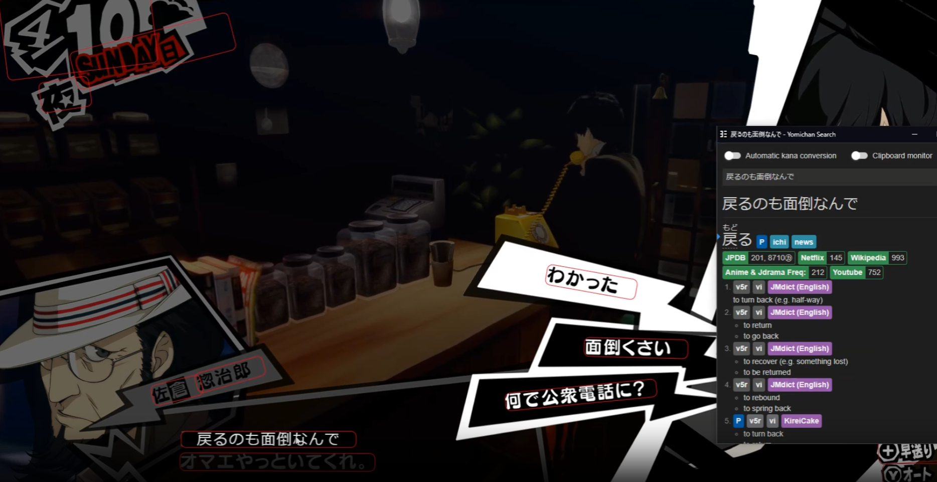 Use the overlay to directly look words up (using Yomitan) in your game, anime, or manga without needing to go to another website to look it up.