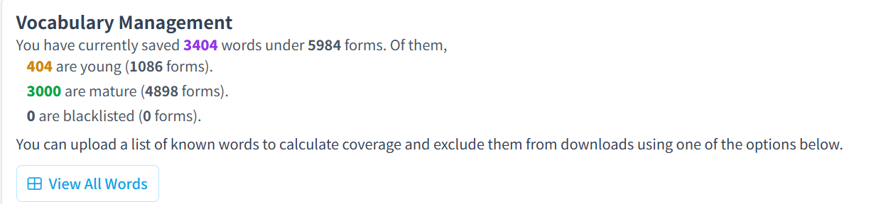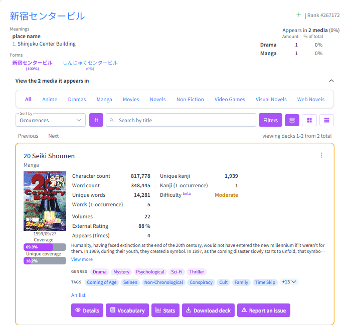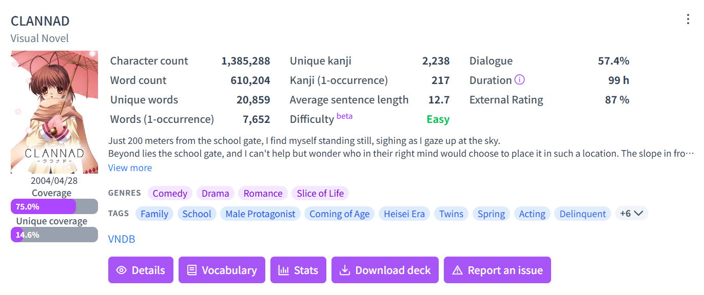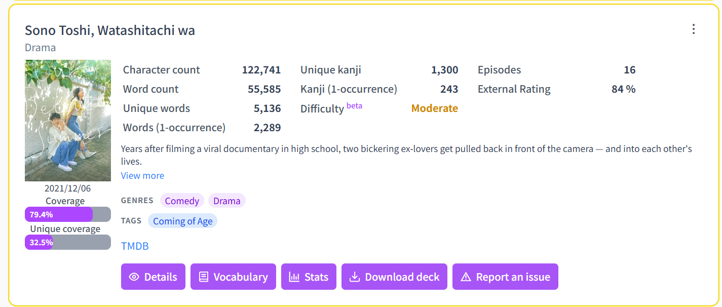 Jiten can then rank how many words in the media you know, and tell you a personalised coverage score.
