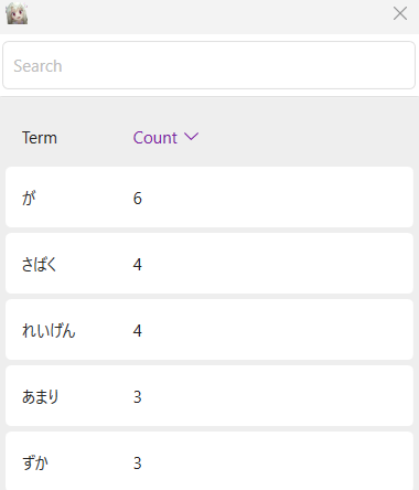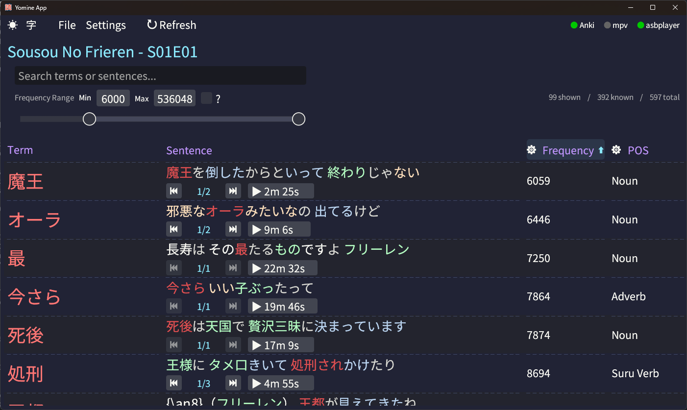 A Japanese vocabulary mining tool designed to help language learners extract and study words from subtitle files. It integrates with ASBPlayer and MPV for timestamp navigation, ranks terms by frequency, and supports Anki integration to filter out known words.