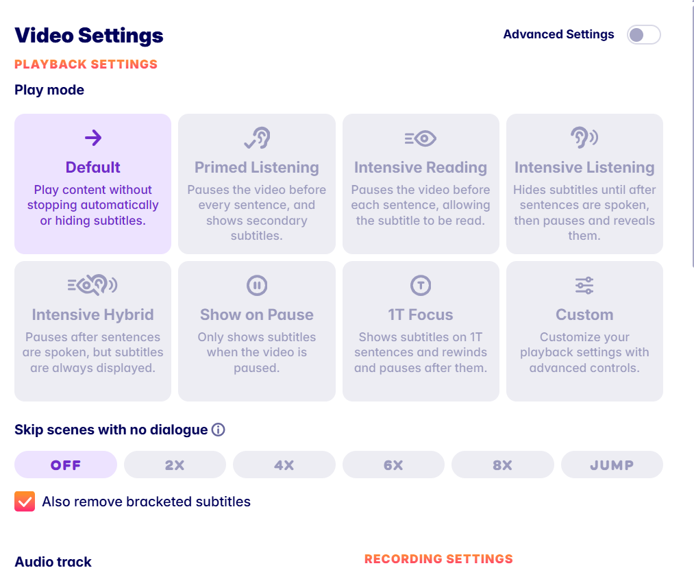 Migaku has about a million different presets for you to watch videos, or you can make your own: