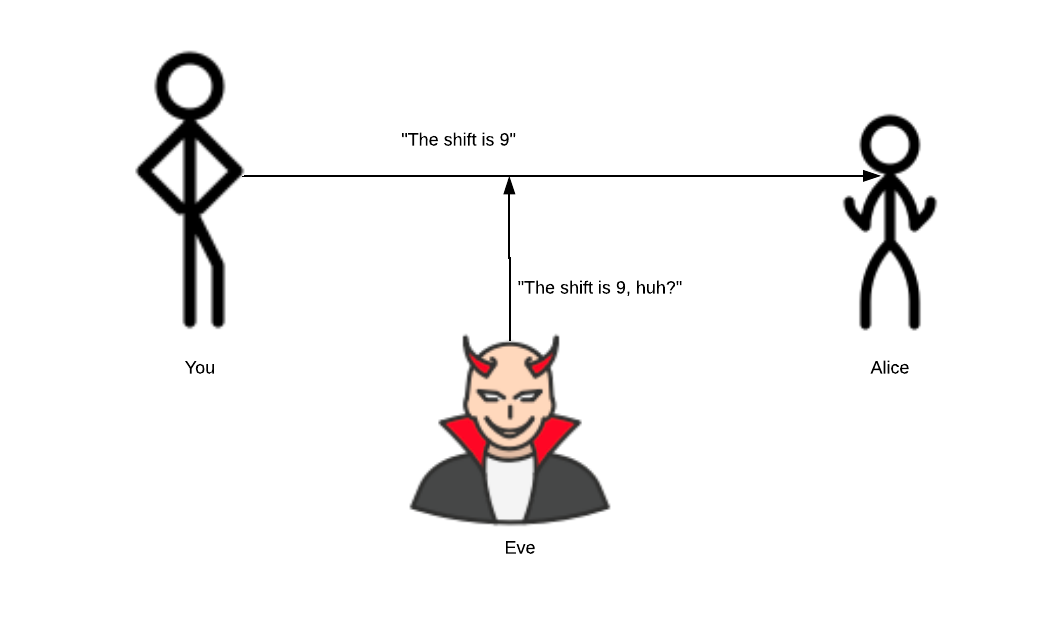 The shift is the key to Caesar’s cipher. But the problem still persists, how do you tell your friend you’re using a shift of 9? Any and all forms of communication can be listened in on. It doesn’t matter if you’re writing a letter or going to a hidden forest in Switzerland 30 miles from the nearest town. If you communicate the key, it can be listened in on.