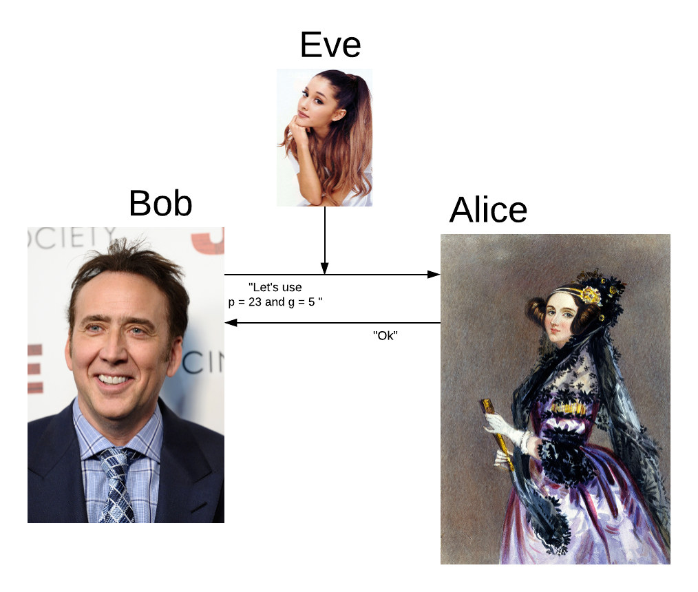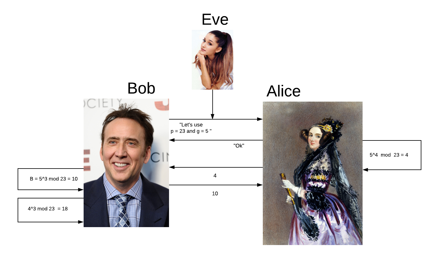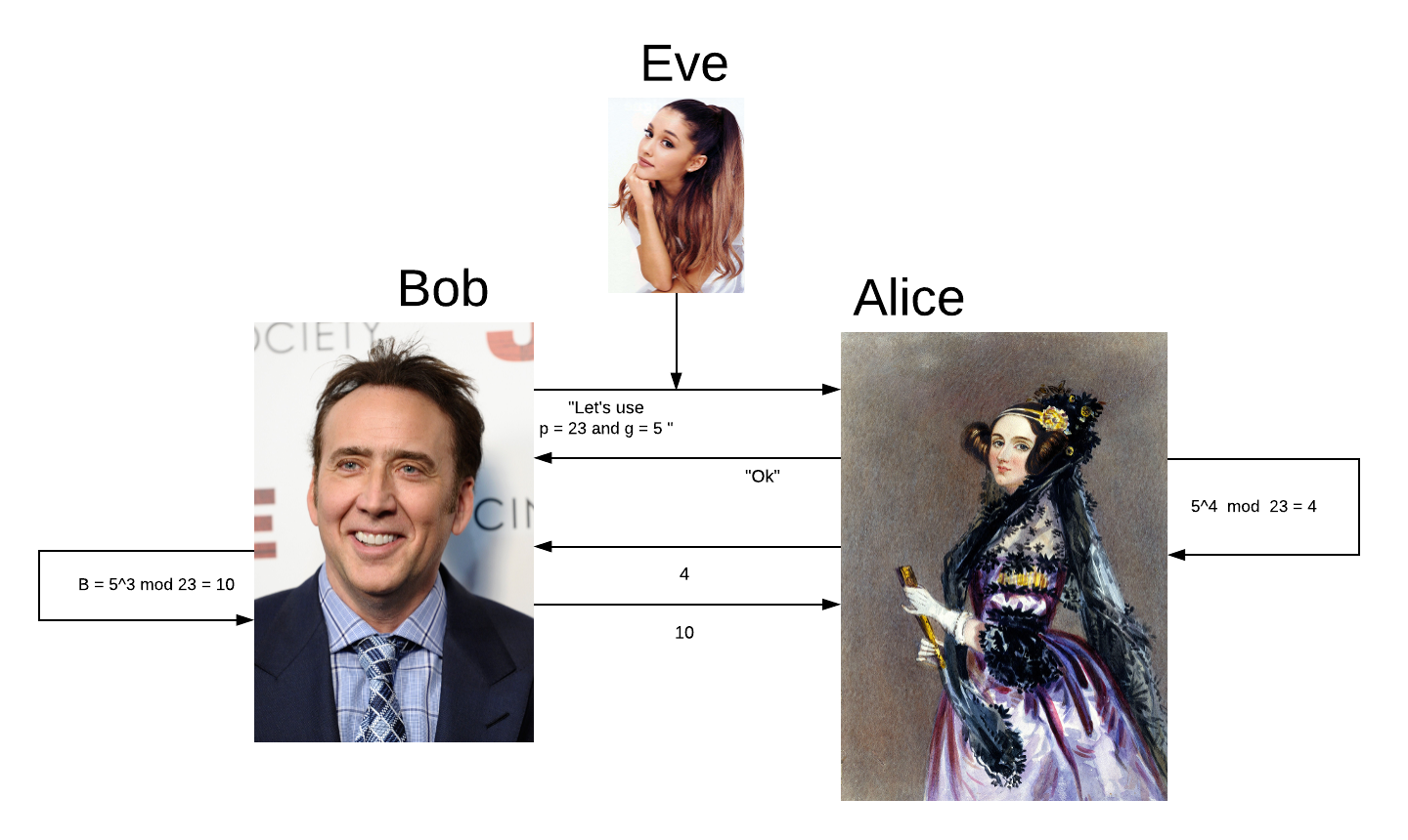 Alice and Bob publicly agree to use a modulus p = 23 and g = 5 (which is a primitive root modulo 23, explained later). Modulus is just the remainder of the division. Note: this example comes from Wikipedia.