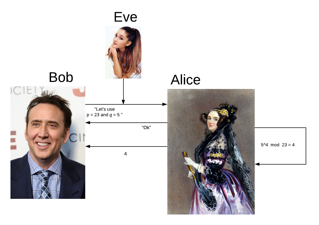 Alice computes A = 54 mod 23 = 4 and sends the number 4 to Bob.