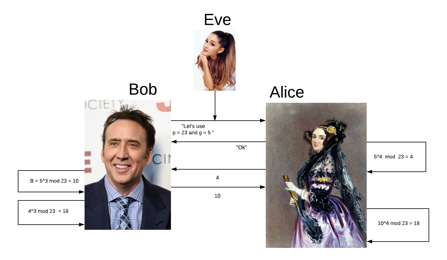 He calculates this by picking a secret number (b) and computes gb mod p. He then sends the result to Alice. Bob creates a random private key, for this example we’ll use 3.