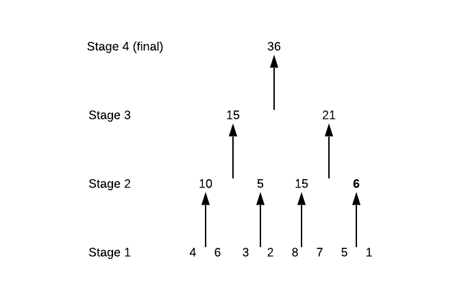 We take the equation “3 + 6 + 2 + 4” and cut it down into the smallest set of equations, which is [3 + 6, 2 + 4]. It could also be [2 + 3, 4 + 6]. The order doesn’t matter, as long as we turn this one long equation into many smaller equations.