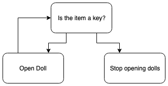 We open up the bigger one and inside is a slightly smaller one. Inside that one is another slightly small doll. Let’s say, inside the last doll is a key. But we do not know how many dolls there are. How do we write a function that opens up the dolls until we find a key?