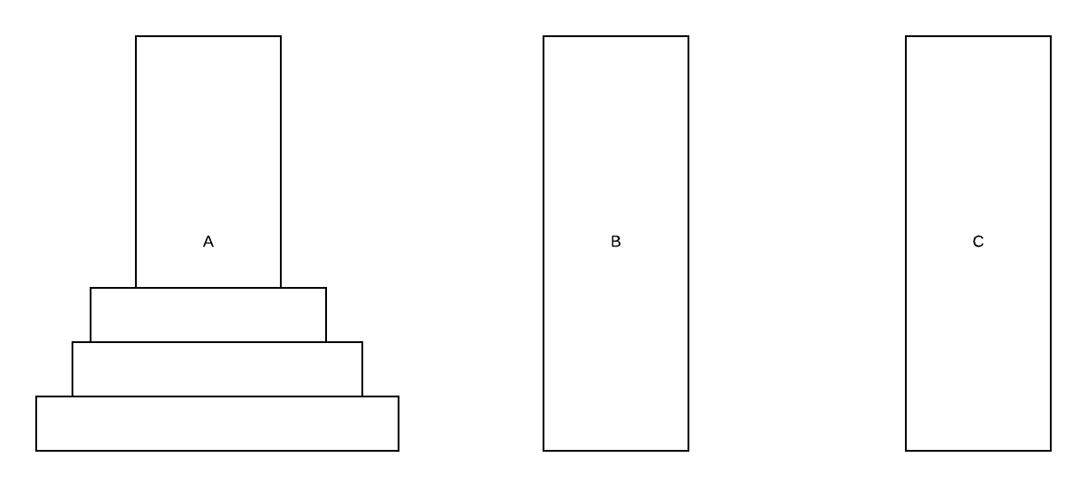 Each disc is a different size. We want to move all discs to peg C so that the largest is on the bottom, the second largest on top of the largest, third largest (smallest) on top of all of them. There are some rules to this game: