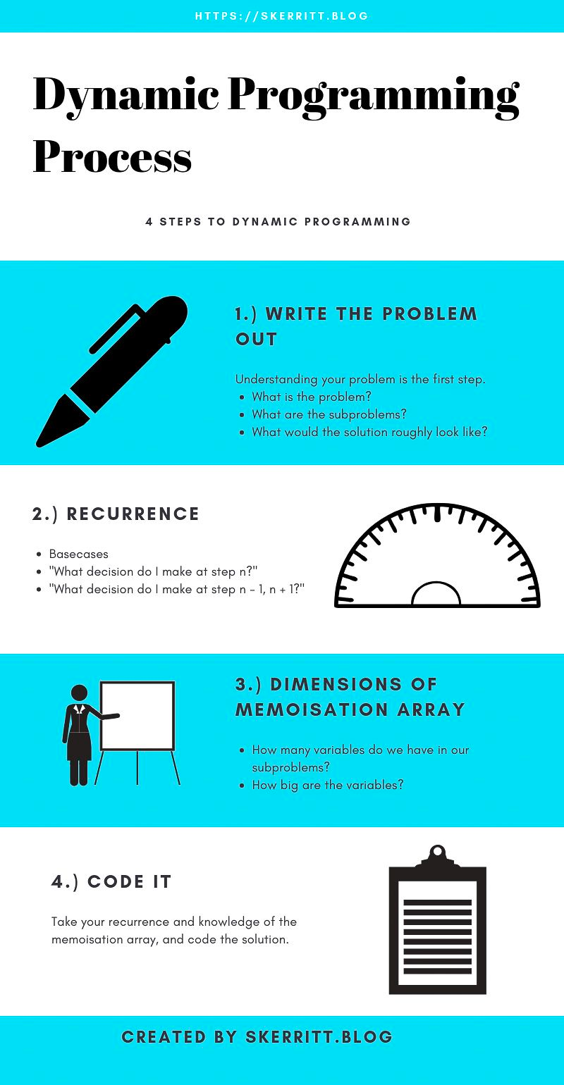 Mastering dynamic programming is all about understanding the problem. List all the inputs that can affect the answers. Once weāve identified all the inputs and outputs, try to identify whether the problem can be broken into subproblems. If we can identify subproblems, we can probably use Dynamic Programming.