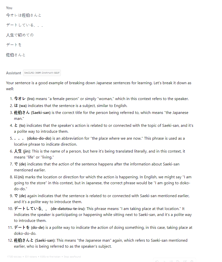 I am learning Japanese. When I give you a sentence, break it down for me. Tell me about the nuance to the words being used. Treat it as once sentence, even if it has new lines. An example of a good output is: