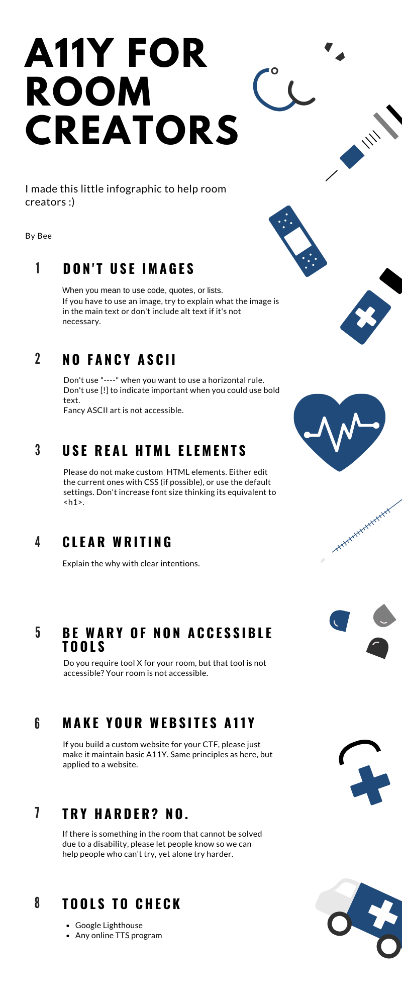 A lot of the time in a CTF you’ll present the user with a website. Be mindful if you are creating a custom-built website, make sure it adheres to A11Y.