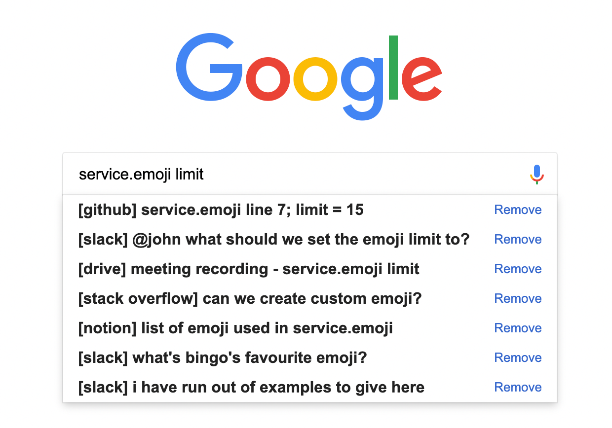 One of the larger problems we had was knowing roughly what we want to find, but not where to find it. For example, let's say service.emoji has a limit on how many emojis it can hold. We want to find both the decision record and the exact number.