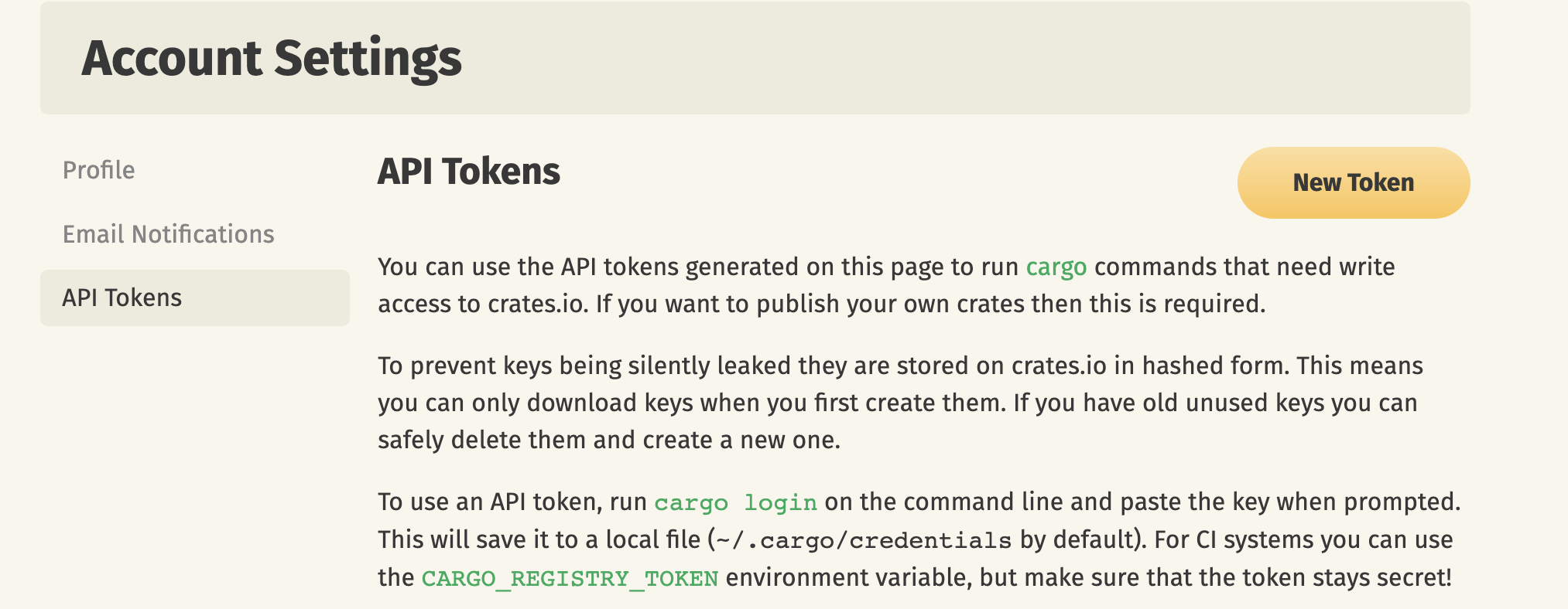 Now we’re ready to publish! Go to the Crates.io website and register an account. Then, go into the settings and create a new API key.
