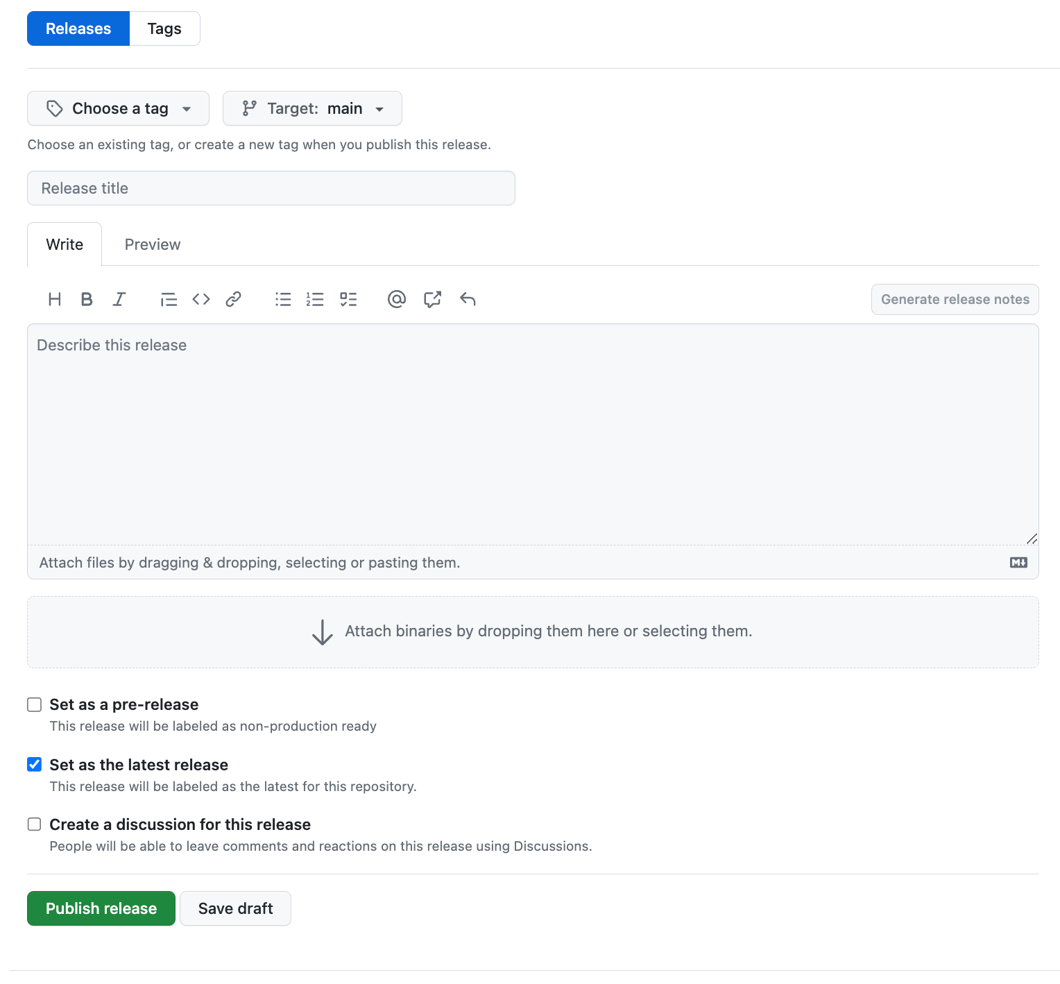 Use semantic versioning to create the Tag Version. Create a new release title, and describe the release.