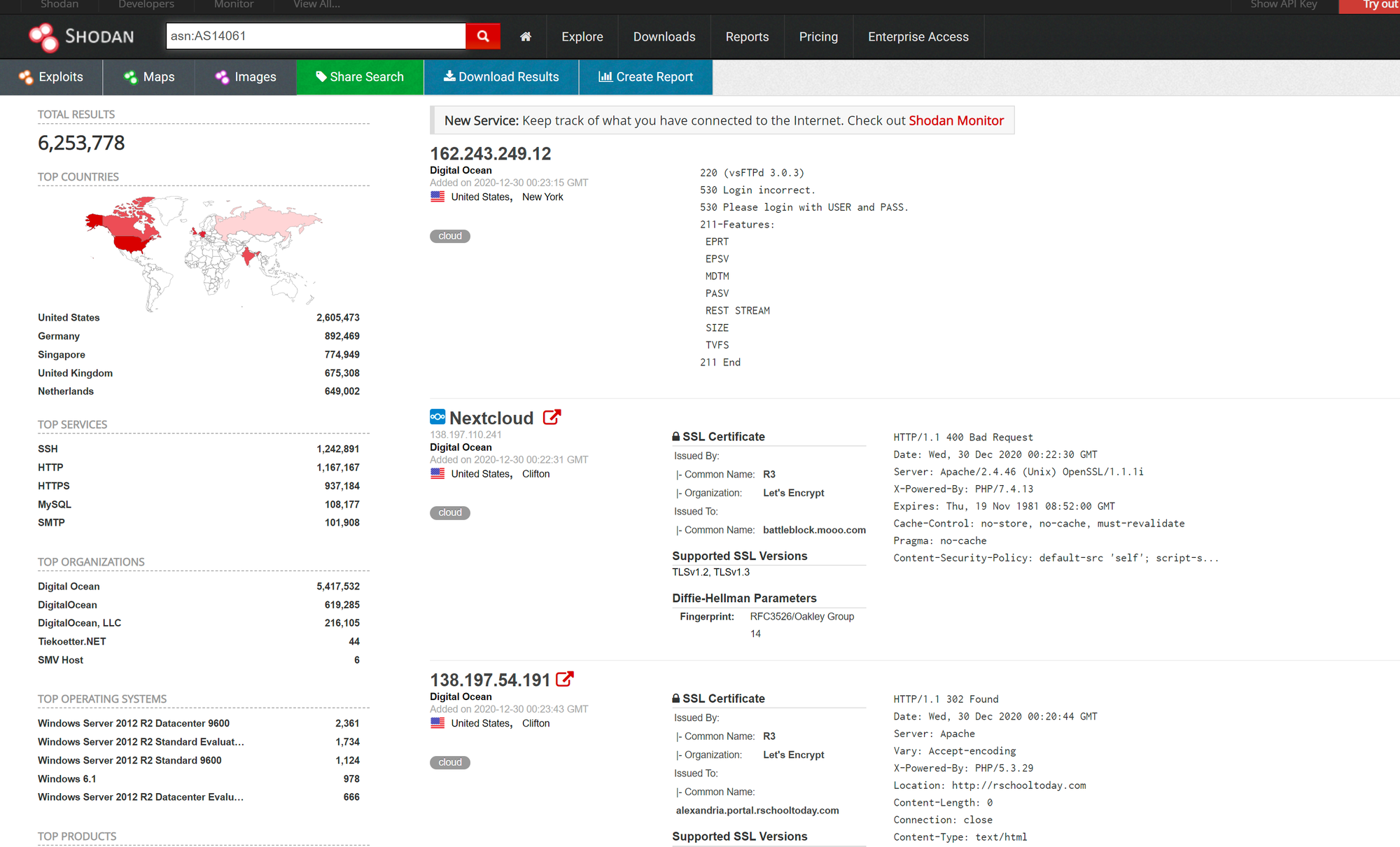 On Shodan.io, we can search using the ASN filter. The filter is ASN:[number] where number is the number we got from earlier, which is AS14061.