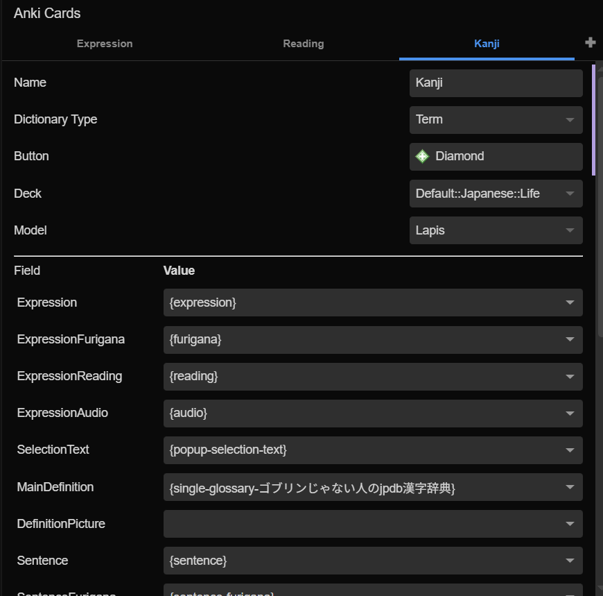 I then click on the Diamond 💠 button, and Yomitan creates an entry in my Anki for that Kanji.