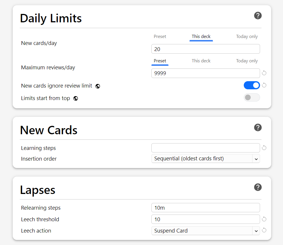 i have also attached my anki settings, i have "learn ahead" set to 0 minutes too. i think doing multiple smaller sessions per day would help me too